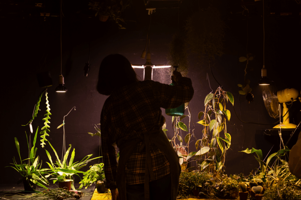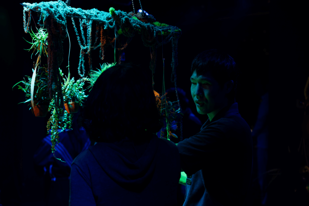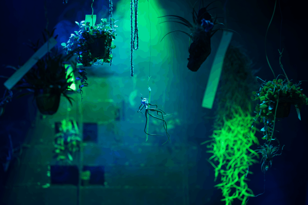 극장은 온통 공중에 매달리고 치렁치렁 늘어진 식물들로 가득 차 있다. 모두 착생식물이다. 물리적인 지지를 위해 다른 식물이나 사물에 붙어 자라지만, 생존에 요구되는 수분과 영양분은 공중에서 따로 흡수할 뿐 의존한 대상의 양분을 빼앗지는 않는다고 한다. 닿아있되 착취하지 않고, 의존하되 기생하지 않는다는 그 식물들이 비스듬히 들어오는 보랏빛의 조명을 받아 환히 빛나고 있다. 옆 사람과 대화를 나눌 수 있을 만큼 낮은 볼륨의 음악이 멀리서 흐른다. 언뜻 보아도 이곳은 지하소극장이라기보다 세련된 화원을, 혹은 플랜팅 이벤트를 진행하는 한시적 팝업스토어를 닮았다.
